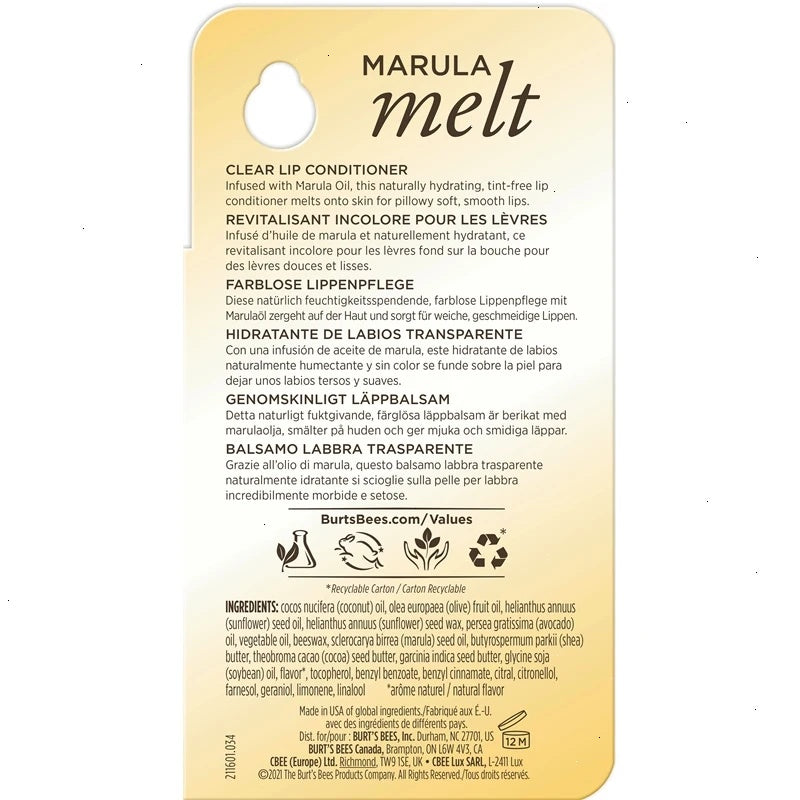 Get pillowy soft, smooth lips with Burt’s Bees® Marula Melt Lip Conditioner. Infused with Marula Oil, this naturally hydrating, tint-free lip conditioner melts onto skin for healthier feeling lips. The non-greasy and creamy texture leaves a dewy finish and 4-hour moisturization to keep lips from drying out.