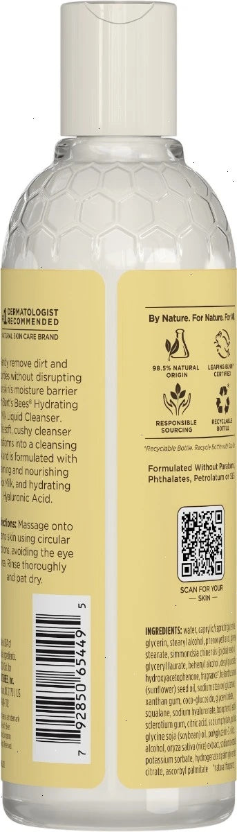This soft, cushy cleanser transforms into a cleansing milk and is formulated with calming and nourishing rice milk and hydrating hyaluronic acid. Gently remove dirt and impurities without disrupting your skin’s moisture barrier with this Burt’s Bees® Hydrating Milk Cleanser. This soft, cushy cleanser transforms into a cleansing milk and is formulated with calming and nourishing rice milk and hydrating hyaluronic acid. The gentle plant-based cleansing agents melt away dirt and impurities without disrupting skin’s moisture barrier, leaving behind a light, naturally derived floral scent that brings peace to the mind.