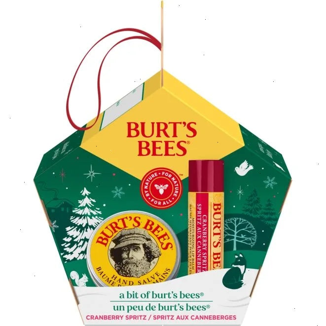 Give your loved ones the gift of soft skin and lips with this Burt's Bees Cranberry Spritz Lip Balm and Hand Salve Gift Set. Infused with cranberry flavor and nutrient-rich botanicals, this lip balm makes lips feel juicy, happy and healthy. It glides on smoothly, leaving behind a tint-free, matte finish and smooth, supple lips that everyone will be buzzing about. Brimming with botanical oils, herbs and responsibly-sourced beeswax, the hand salve delivers the hydration your dry hands need.