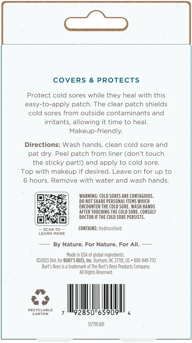 Say goodbye to discomfort and hello to a healthier, happier smile with Burt's Bees Cold Sore Healing Patches. Natural ingredients, targeted relief, faster recovery. Burt’s Bees Cold Sore Healing Patches create a protective barrier from outside elements, contamination and irritants to not only promote the healing of cold sores, but also to hide them while they heal so you can feel good about your skin.