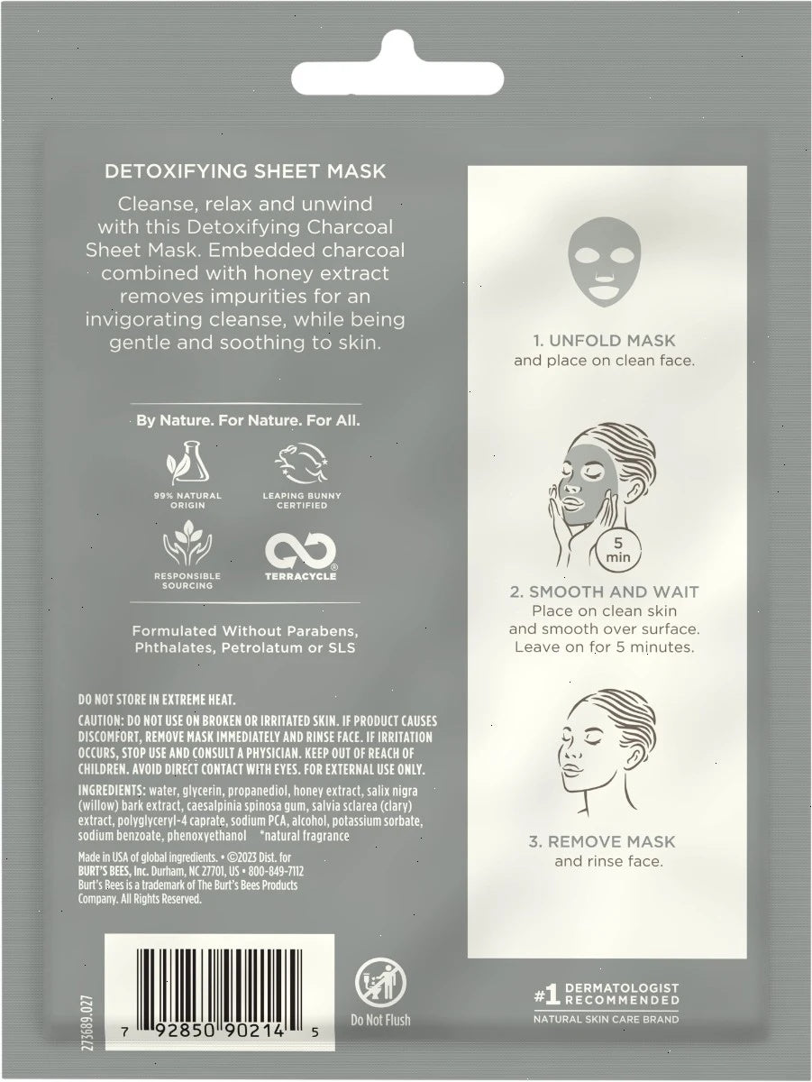 Burt’s Bees™ Detoxifying Charcoal Sheet Mask removes impurities for an invigorating cleanse while being gentle and soothing to skin. The sheet mask features embedded charcoal to help remove impurities, dirt and grime from the surface of your skin providing a fresh clean appearance.