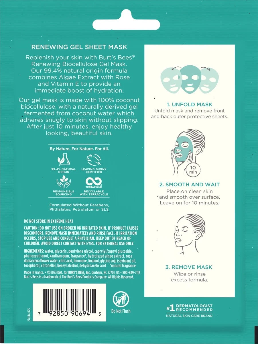 Burt’s Bees® Renewing Biocellulose Gel Sheet Mask helps smooth and moisturize skin with the renewing benefits of nutrient-rich botanicals. This naturally derived face mask comfortably contours to your face and is packed with superstar ingredients including Rose and Algae Extract and Vitamin E that penetrates deep into the skin. The powerful antioxidant properties of Algae and Rose Extract, replenishes the skin and delivers ultra-hydrating benefits that leaves the skin feeling smoother, healthy-looking and naturally beautiful. Featuring a biocellulose form, naturally derived from coconuts, the sheet mask adheres snugly to your skin to prevent slipping and sliding and it ensures each part of your face absorbs the skin-loving nutrients. The soft gel-like texture is cool to the skin upon application as it soothes, calms and refreshes skin with a boost of moisture.