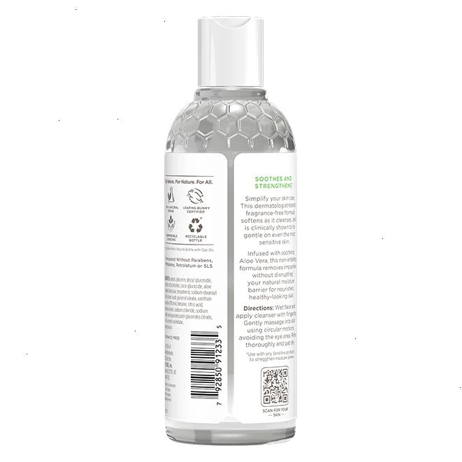 Simplify your skin care. This dermatologist-tested, fragrance-free formula softens as it cleanses, and is clinically shown to be gentle on even the most sensitive skin. Infused with soothing Aloe Vera, this non-irritating formula removes impurities for nourished, healthy-looking skin. This facial cleanser for dry skin has a 98.7% natural origin formula that contains Aloe Vera and is also formulated without parabens, phthalates, petrolatum or SLS.