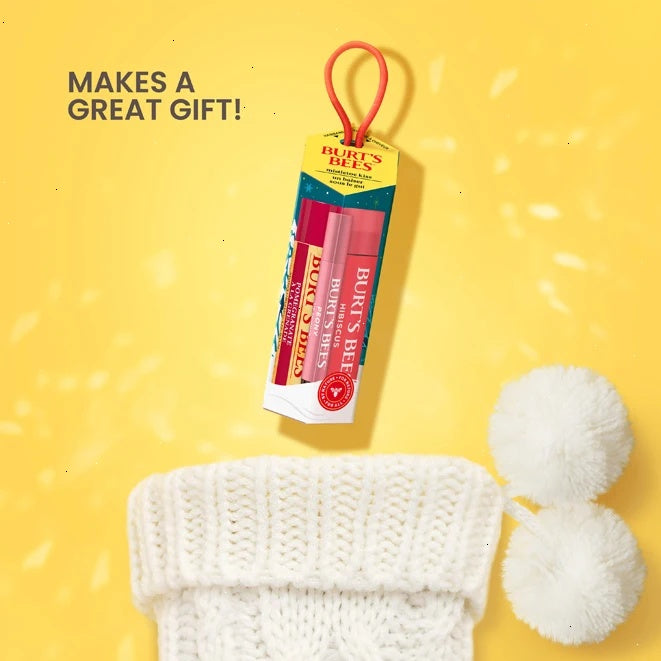 Stay mistletoe-ready with soft, bright and shimmery lips when you use Burt's Bees Mistletoe Kiss Lip Balm, Tinted Lip Balm and Lip Shimmer Gift Sets. Bursting with all-natural vanilla, shea butter and vitamin E, the flavored lip balm happily hydrates and revitalizes your lips. Choose from a red or pink set. The Red Gift Set includes Red Dahlia Tinted Lip Balm, Fig Lip Shimmer, and Vanilla Bean Lip Balm. The Pink Gift Set includes Hibiscus Tinted Lip Balm, Peony Lip Shimmer, and Pomegranate Lip Balm. Burt's Bees tinted lip balms are made using botanical waxes and shea butter, delivering 8 hours of moisture and a hint of flattering neutral lip color. Burt's Bees Lip Shimmers are made with shea butter and antioxidant-rich fruit oils, and offer a smooch of luminescent pigmented color with high-impact moisture and an invigorating peppermint flavor.