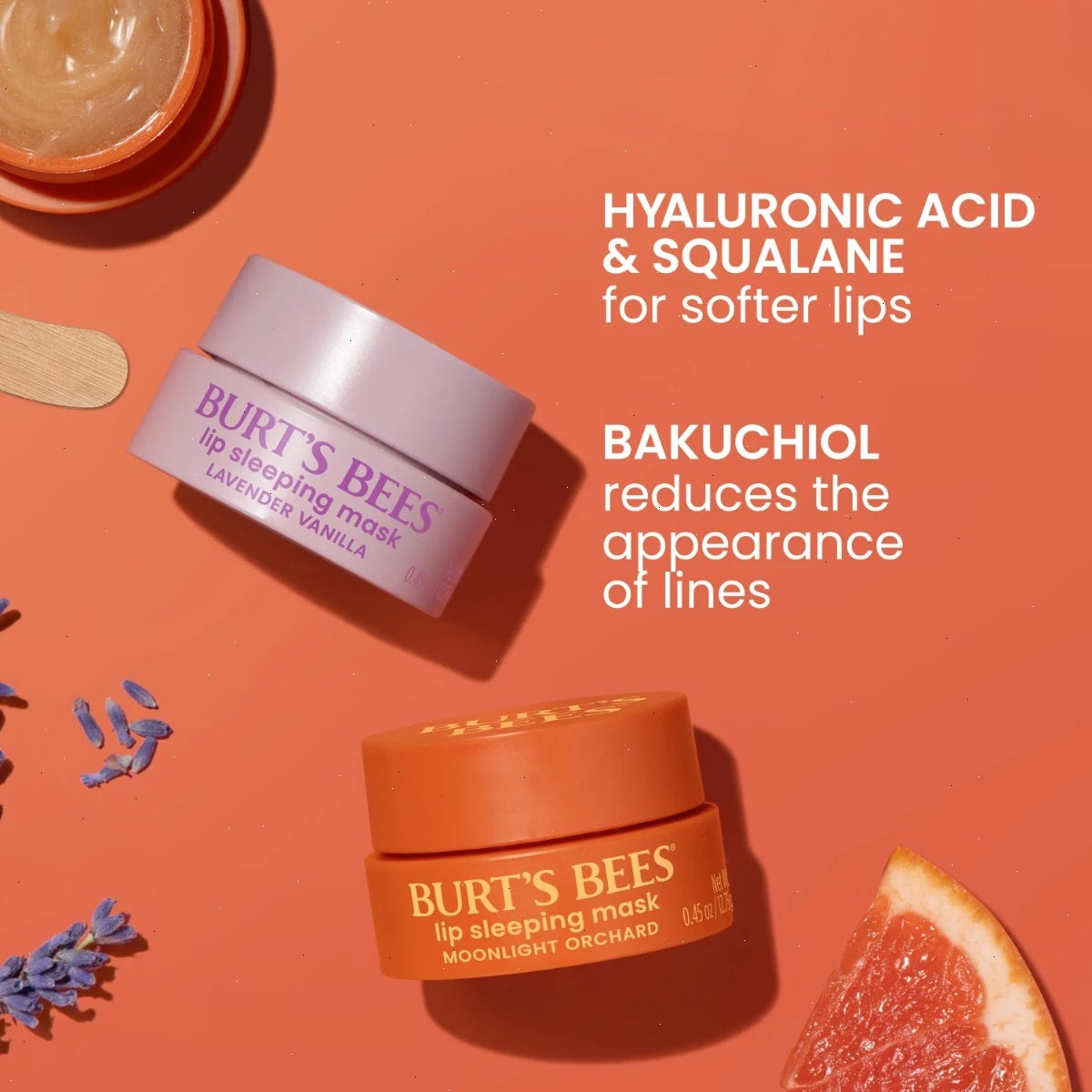 Indulge in a luxurious nighttime routine with this NEW Burt’s Bees® Lip Sleeping Mask. This nighttime lip mask plumps, smooths and softens lips overnight, delivering 12 hours of moisturization as you sleep. It is formulated with nutrient rich ingredients like plant derived squalane, hyaluronic acid and bakuchiol. Hyaluronic acid helps increase skin hydration, while bakuchiol helps reduce the appearance of fine lip lines.